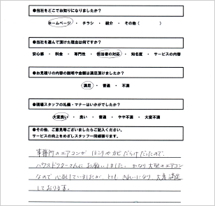 汚れがキッチリと取れているか?臭いはどうおなったか?など、エアコンクリーニングの前に気になっていた項目がどう変わったかを、お客さまにご報告します。