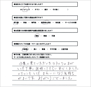 お客様にご挨拶の後、作業内容や作業時間・その他お客様が気になる箇所などお尋ねします。スタッフに遠慮なくお申しください。